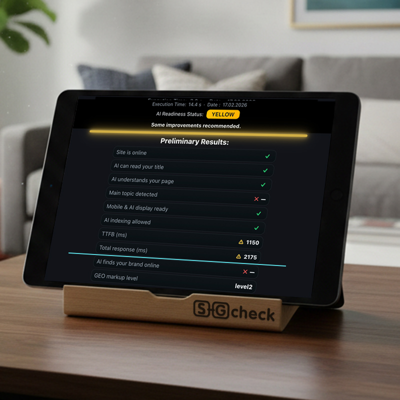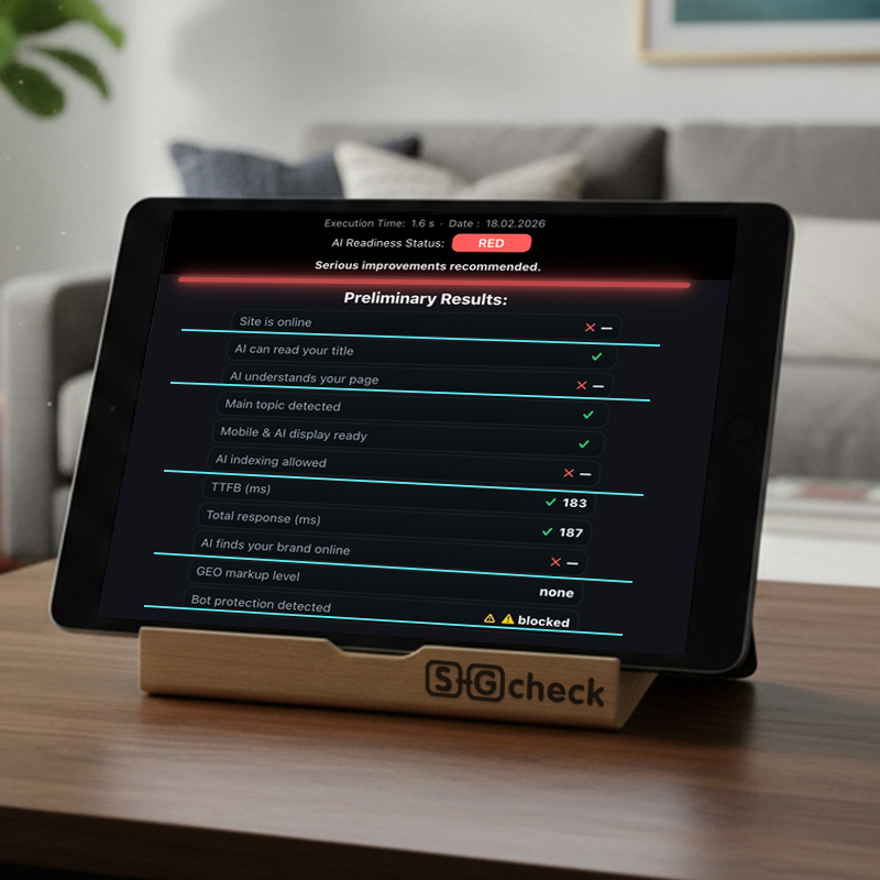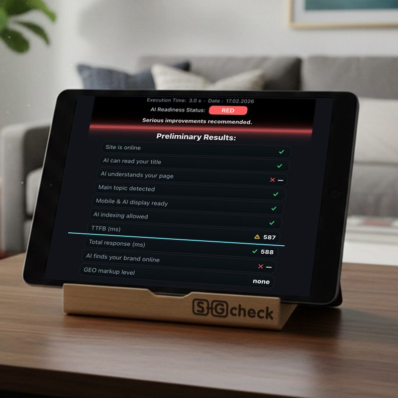 SEO GEO CHECK free bietet dir ein sofortiges Scanning (5–10 Sek.). Du erhältst einen Express-Bericht zum Status deiner Optimierung: